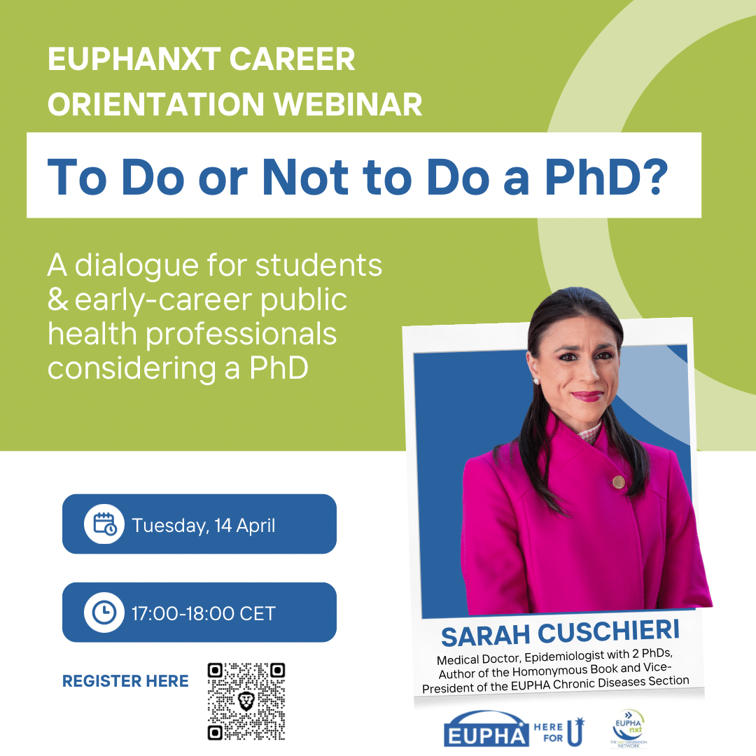 The webinar by EUPHAnxt is primarily aimed at its community, especially students and early-career public health professionals who are considering pursuing a PhD.