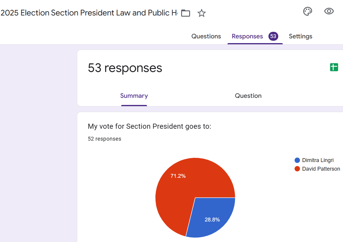 As you can see David Patterson received 72,2% of the 52 votes and Dimitra Lingri 28,8%.